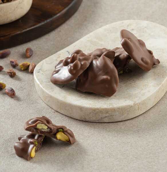 İçindekiler: Antep Fıstıklı, Çikolata, Şeker, Kakao Yağı, Kakao Kitesi, Emulgator (Ayçiçek Lesti E322), Doğal Aroma Verici (Vanilya), Parlatıcı (Gum Arabic), Badem, Kakao Kuru Maddesi (Min: %55).