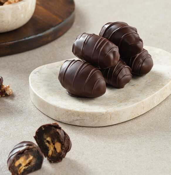 İçindekiler: Kudüs Hurması, Ceviz İçi, Bitter Çikolata, Şeker, Kakao Yağı, Kakao Kitesi, Emulgator (Ayçiçek Lesti E322), Doğal Aroma Verici (Vanilya), Parlatıcı (Gum Arabic), Badem, Kakao Kuru Maddesi (Min: %55).