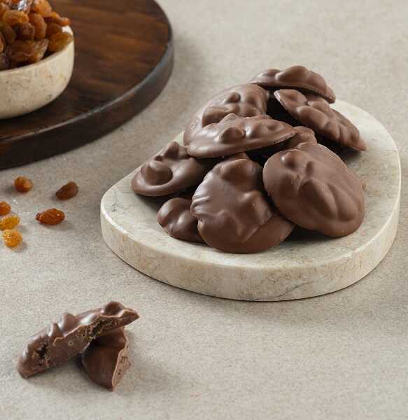 İçindekiler: İzmir Üzüm, Çikolata, Şeker, Kakao Yağı, Kakao Kitesi, Emulgator (Ayçiçek Lesti E322), Doğal Aroma Verici (Vanilya), Parlatıcı (Gum Arabic), Badem, Kakao Kuru Maddesi (Min: %55).